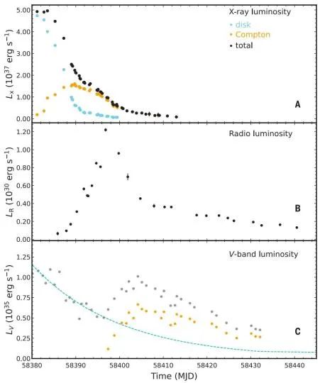 ▲黑洞X射线双星MAXI J1820+070的多波段光变示意图。(武汉大学 游贝 供图)