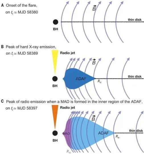 ▲吸积流、磁场、喷流演化的示意图。(武汉大学 游贝 供图)