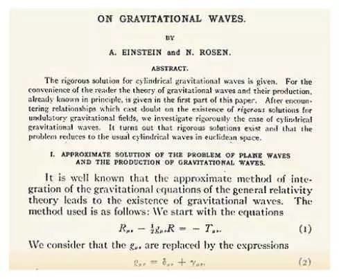 引力波是否存在一直是一个有争议的问题,甚至爱因斯坦自己都怀疑引力波的存在。1936 年爱因斯坦和他的助手罗森写了一篇引力波不存在的论文(题目是“引力波存在吗”)投稿到美国《物理评论》,编辑部依据匿名审稿人的审稿意见拒绝发表该文;后来爱因斯坦接受了他在普林斯顿大学的好友罗伯森的意见改写了论文(并修改了引力波不存在的错误结论,但是他并不知道罗伯森其实就是匿名审稿人),题目也改为《论引力波》并在富兰克林学院学报上发表。