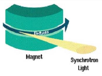 激光等离子体光属于价格便宜、易于操作的光源,可以用于X射线显微术,象电子扫描显微镜一样作为实验室的常规分析工具。其基本原理是:当高强度(1014~1015 W/cm2)激光脉冲聚焦打在固体靶上时,靶的表面迅速离化形成高温高密度的等离子体,进而发射X射线。它是一种具有足够辐射强度的独立点光源,所用泵浦激光器主要有Nd:YAG,钕玻璃和KrF等。X射线发射与靶材料有关,由于溅射残屑可能损伤和污染光学系统和样品,若用气体靶代替固体靶可以避免残屑问题。因此,需要进一步研究开发有效的、高重复频率工作的、不产生残屑的激光等离子体X射线光源。 同步辐射光源 速度接近光速的带电粒子在磁场中作圆周运动时,会沿着偏转轨道切线方向发射连续谱的电磁波(左图)。1947年人类在电子同步加速器上首次观测到这种电磁波,并称其为同步辐射,后来又称为同步辐射光。同步辐射最初是作为电子同步加速器的有害物而加以研究的,后来成为一种从红外到硬X射线范围内有着广泛应用的高性能光源。同步辐射光源是开展凝聚态物理、材料科学、生命科学、资源环境及微电子技术等多学科交叉前沿研究的重要平台。