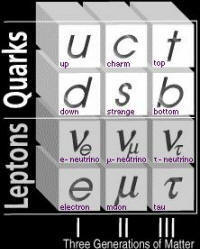 费米子可以分为三个“世代”(左图)。第一代包括电子、上及下夸克及电子中微子。所有普通物质都是由这一代的粒子所组成;第二及第三代粒子只能在高能量实验中制造出来,且在短时间内衰变成第一代粒子。这些粒子排列成三代是因为每一代的四种粒子与另一代相对应的四种粒子的性质几乎一样,唯一的分别就是它们的质量。