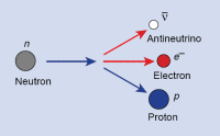 1933年,费米提出的β衰变定量理论指出:β衰变就是核内一个中子通过弱相互作用衰变成一个电子、一个质子和一个 反中微子(右图)。中微子只参与弱作用,具有最强的穿透力。由于中微子与物质间的相互作用极其微弱,中微子的检测非常困难。