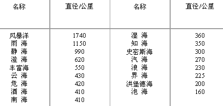 环形山是碗状凹坑结构,月球上直径大于1公里的环形山有3万3千多个,占月面表面积的7-10%,最大的是南极附近的贝利环行山,直径295公里。月球上还有洋、海、湾、湖等各种名称,其实月球表面并没有水。月球上有22个月海,其实是广阔的平原。最大的是风暴洋,面积约500万平方公里。