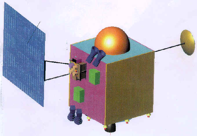 2003 年11月,印度空间研究组织宣布,将于2008年发射 “ 月球飞船 ”1号(Chandrayaan I)探测器(右图)。该探测器重 525公斤,它将进入月球轨道,拍摄可见光、近红外及 X 射线月球图像。印度计划于2015 年前向月球发送航天员。印度的登月计划将与俄罗斯合作。