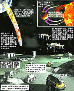 综合国际上月球探测的成果及世界各国“重返月球”的战略目标和实施计划,根据我国的科技水平、综合国力和国家整体发展战略,近期的月球探测以不载人月球探测为宗旨,分为“绕”、“落”、“回”三步。(左图)