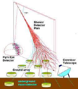 空气簇射的成份主要以轻子居多,重子最少。探测空气簇射有三种方式:地面(及地下)阵列、切伦可夫望远镜、荧光望远镜(左图)。