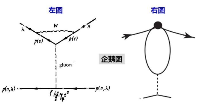 1975年7月,三位俄罗斯理论物理学家Arkady Vainshtein、Valentin I. Zakharov和Mikhail Shifman在前苏联的专业物理学期刊JETP Letters上发表了一篇讨论K介子衰变的论文,其中第一次计算了奇异夸克(strange quark)通过下面左图所进行的单圈衰变过程。1995年10月,Mikhail Shifman教授在回忆20年前的这一重要工作时,把相应的费曼图(Feynman diagram)简化成了下面的右图,这就是粒子物理学中著名的“企鹅图”。