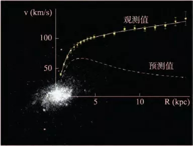 图4所示是一个称作M33的星系中恒星绕星系中心旋转的速度随着到星系中心距离的分布,上边的曲线是观测到的速度,而下边的曲线是根据观测的可见物质预计的速度分布。我们看到,两者有着明显的差别,实际测量的结果要远大于计算结果,这表明还有不可见的物质增大了引力,这是天文学家推测暗物质存在最直接的观测证据。根据不同距离处旋转速度的大小可以推算暗物质的分布,因而我们可以得到如图5所示的银河系中的物质分布图。从图5可见,我们银河系的恒星大部分分布在一个很小的盘状结构中,这就是我们熟悉的银盘。在银盘外边包围着巨大的暗物质构成的球状的结构,称作暗物质“晕”。