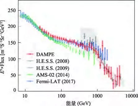 我国的“悟空”卫星就是希望能够在更高的能量范围内测量宇宙线电子的能谱(由于“悟空”探测器不带磁场,因而无法区分正负电荷,它测量的实际是电子和正电子加起来的能谱,我们统称为电子能谱),从而可以帮助研究宇宙线超出的正电子的来源。“悟空”的第一个实验结果在2017年底发表(图11),这个结果是第一次通过空间直接探测,把宇宙线电子的能量测量到4.6TeV,并发现了能谱的“拐折”的结构,但是,这些还是不足以确认是否存在暗物质。寻找暗物质可能需要在更高能量及更高精度上进行研究。我国空间站的未来宇宙线实验HERD将可能在这方面取得重要的突破,为暗物质寻找提供更多的线索。