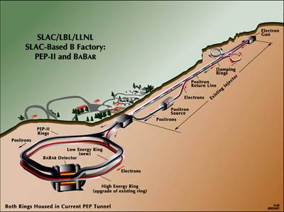 斯坦福直线加速器中心1994年起对PEP的储存环加以改进,改进后PEP-II成为B工厂,使更多的正负电子发生对撞,产生B和`B粒子。该工程总造价17.7亿美元,包括建造大型探测器BaBar的费用在内。1998年投入运行,2001年BaBar实验宣布观测到宇称破缺,这是一种可能决定宇宙中物质多于反物质的现象。