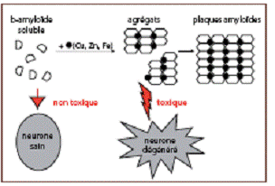 左:正常可溶性β淀粉,健康神经元; 右:铜、锌、铁离子介入,β淀粉凝聚成板状,生病的神经元