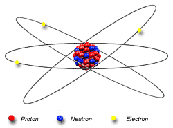 原子核由质子(Proton)和中子(Neutron)组成,二者质量等同;电子(Electron)的质量要比前两者小2000倍,并以惊人的高速度围绕原子核运转。