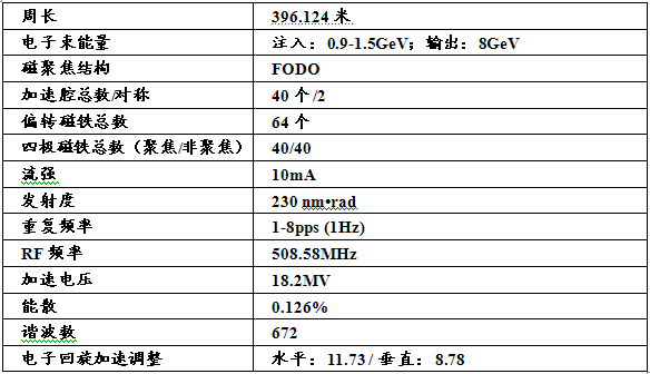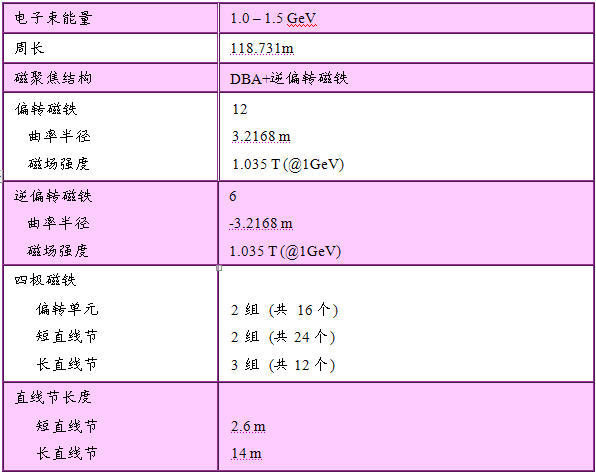 巨大的环形,周长1436米。它的常规单元由2个偏转磁铁、10个四级磁铁、7个六级磁铁组成,长约30米。直线节位于常规单元之间,用于安装插件、射频加速腔,束流注入系统,束流诊断系统等,共计44个直线节。