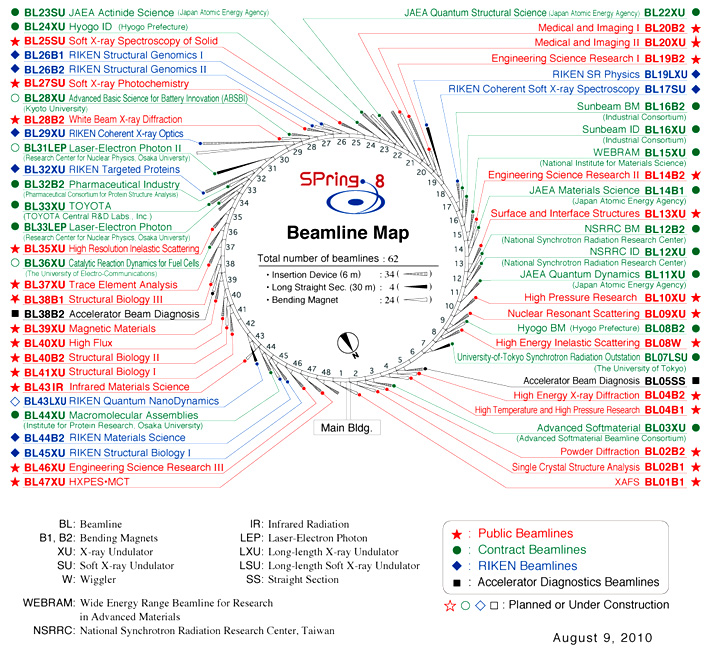SPring-8拥有由偏转磁铁引出的光束线22条,最多可建24条;由插入件引出的光束线26条,最多可建34条,直线节长度4.5米;由长插入件引出的光束线1条,最多可建4条,长直线节长度25米。这些光束线一般设计在80米之内,但有9条可延伸至300米,3条可延伸至1公里。