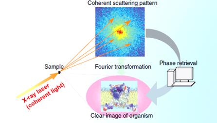 成像过程:X射线激光→样品→相干散射模式→相位恢复→结构清晰图像