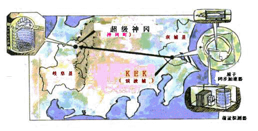 图中有K2K实验的一些重要方面。深黑色的箭头是250公里的通道,中微子从KEK穿过该通道到达超级神冈。绿色部分是“日本的阿尔卑斯山”,束流从其下部穿过。右边中间展开部分是模仿KEK实验室的地面,有束流靶区和前置探测器大厅。