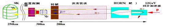 12 GeV质子同步加速器的强质子束流在铝靶处产生无数p介子。这些p介子聚焦,在200米的衰变道中衰变成m子和中微子。从转储屏蔽产生的中微子在1毫秒内通过前置探测器到达超级神冈。