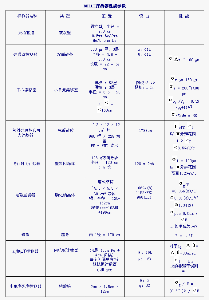 BELLE实验的目标是观测B介子衰变中的CP破坏,更好地了解CP破坏现象。物理实验使用的探测器性能如下表所示: