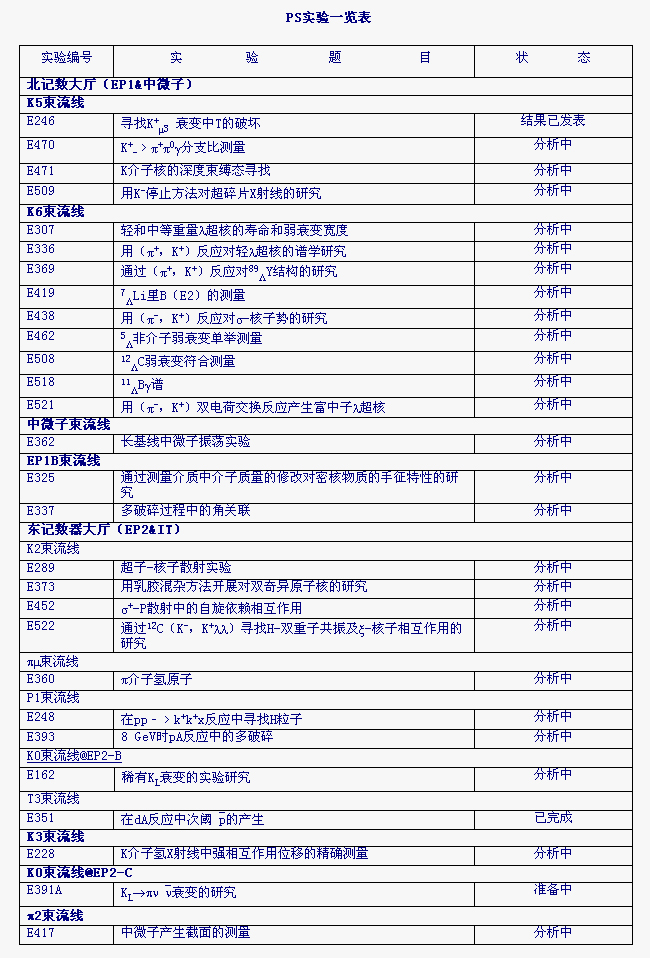 1995年以来,KEK和来自国外的一些物理学家利用KEK的质子同步加速器做了大量实验,一些实验的结果已经发表,一些实验所获得的数据正在分析中,少量实验正取数据,个别实验正在准备中。所有实验涉及以下几个方面:K稀有衰变,强子物理,奇异核物理、中微子振荡和原子物理。具体实验项目,请见以下PS实验一览表。