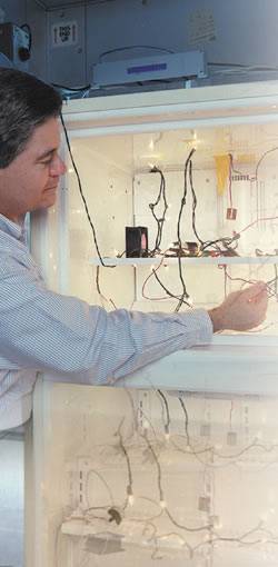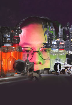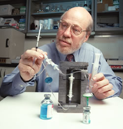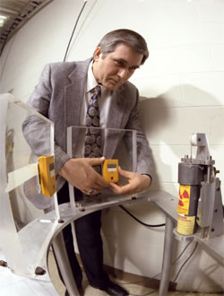 从稳定的电磁型同位素分离器浓缩的同位素所产生的放射性医用同位素,包括用于治疗前列腺癌的钯103、心脏成像用的铊201、治疗癌症和手术后心瓣再狭窄用的铼、肿瘤成像用的镓67和缓解转移性骨痛的锶89。非医用产品包括用于电子学和探测爆炸物的镍63以及用于地球定位和蜂窝式电话系统用的原子钟的镓87。1998年以来,电磁型同位素分离器一直处于备用状态直到需要为止。右图:Russ Knapp领导开发了铼188生成器。在这种生成器里,钨188衰变为铼188。它被用来治疗心脏病人的心脏狭窄和癌症引起的疼痛。