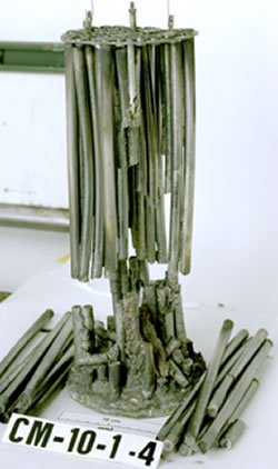 六十年代末,由Grady Whitman领导的ORNL研究人员开始研究暴露在高温和辐射造成脆化情况下,反应堆压力容器的钢壁在反应堆操作时是否可承受水的压力而不破裂。ORNL进行了30多年的热冲击、断裂力学和辐射造成脆裂方面的实验后,已成为世界上产生提供特许和运行轻水反应堆压力容器基础的数据方面的领导者。 左图:八十年代中,在试验核安全中,将成捆的非核燃料棒加热直到熔化,以确定安全温度的极限。