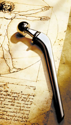 研究人员发现离子植入能改进外科植入人造关节使用的钛和钴铬合金,但涉及不同的机制。技术使钛合金的表面硬化,但不会被合金自己的氧化涂层(降低表面化学活性)擦伤。对钴铬合金来说,离子植入改进它的吸湿度,这样使人造关节滑动起来就更容易,并使表面的硬度更均匀。因此,合金与其搭配使用的聚合物组件工作时会配合得更好,从而延长它的寿命。九十年代早期,美国食品与药物管理局提出指导原则,要求所有新提交的钛矫形设备均应离子植入。左图:植入离子的髋关节。