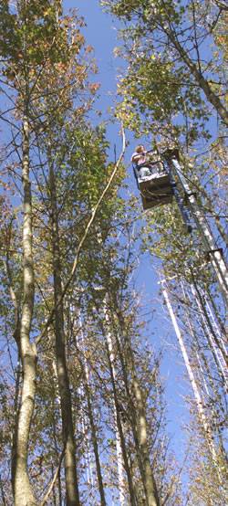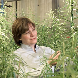 20年的一项能源部计划,工业有了更有效的用于造纸、建材和家具的纸浆和木材来源。能源部生物能的供料开发计划的原来目的,是开发可转化为燃料在农场生长的可持续性的农作物。然而,由于ORNL与美国农业森林服务部门、农业研究站、多所大学和几家林木产品公司的合作,选择和开发了几种快速生长的树木和草,它们可用于木制产品和能源。白杨和柳枝稷作为典型的农作物出现。左图:Janet Cushman在检查快速生长的柳枝稷,像杂交白杨一样,它是潜在的能源来源。