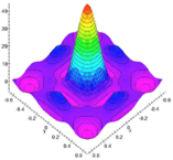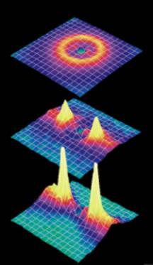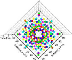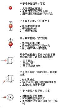 SNS的仪器如中子谱仪将用来确定晶体、陶瓷、超导体和蛋白质中原子的位置和排列。中子谱仪是如何工作的呢?由散裂中子源产生的中子脉冲沿着飞行轨道到样品。由于中子有各种能量和波长,所以它们按时间分布,给出一个到样品的连续谱。左图为通过让中子源的中子全谱从一个晶体散射进入到对位置敏感的多个探测器获得原子结构。当晶体中原子之间的距离与入射的中子的波长匹配时,那个中子就散射进入记录散射中子位置(散射角度)和到达时间的多个探测器中。结果是个峰值图,显示各种数量的中子到达多个探测器中每点的不同位置和到达时间。 这一图形告诉科学家不同原子在晶体中是如何排列的。以相同原理为基础的仪器可以用来确定玻璃和复杂流体的原子结构,或工业部件中的残余应力。测量非弹性散射的仪器需要测量中子跨越往返样品路线的时间。用这种方法,仪器可以确定重要材料的激发谱和使原子保持在一定位置的力。飞行时间技术使为每个中子脉冲搜集大量数据点成为可能。测量中子时间飞行仪器的效率和产生流强不断提高以加速器为基础的散裂中子源的能力,将来可以不断提供改进的中子源。右图为 从多个探测器在时间和空间上为高温超导体YBa2Cu3O7获得的图像。从此图像中可获得原子的位置。