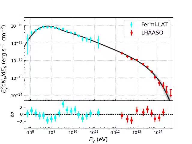 图2:W51区域的宽波段伽马射线能谱测量,以及强子相互作用模型对能谱数据的拟合结果。