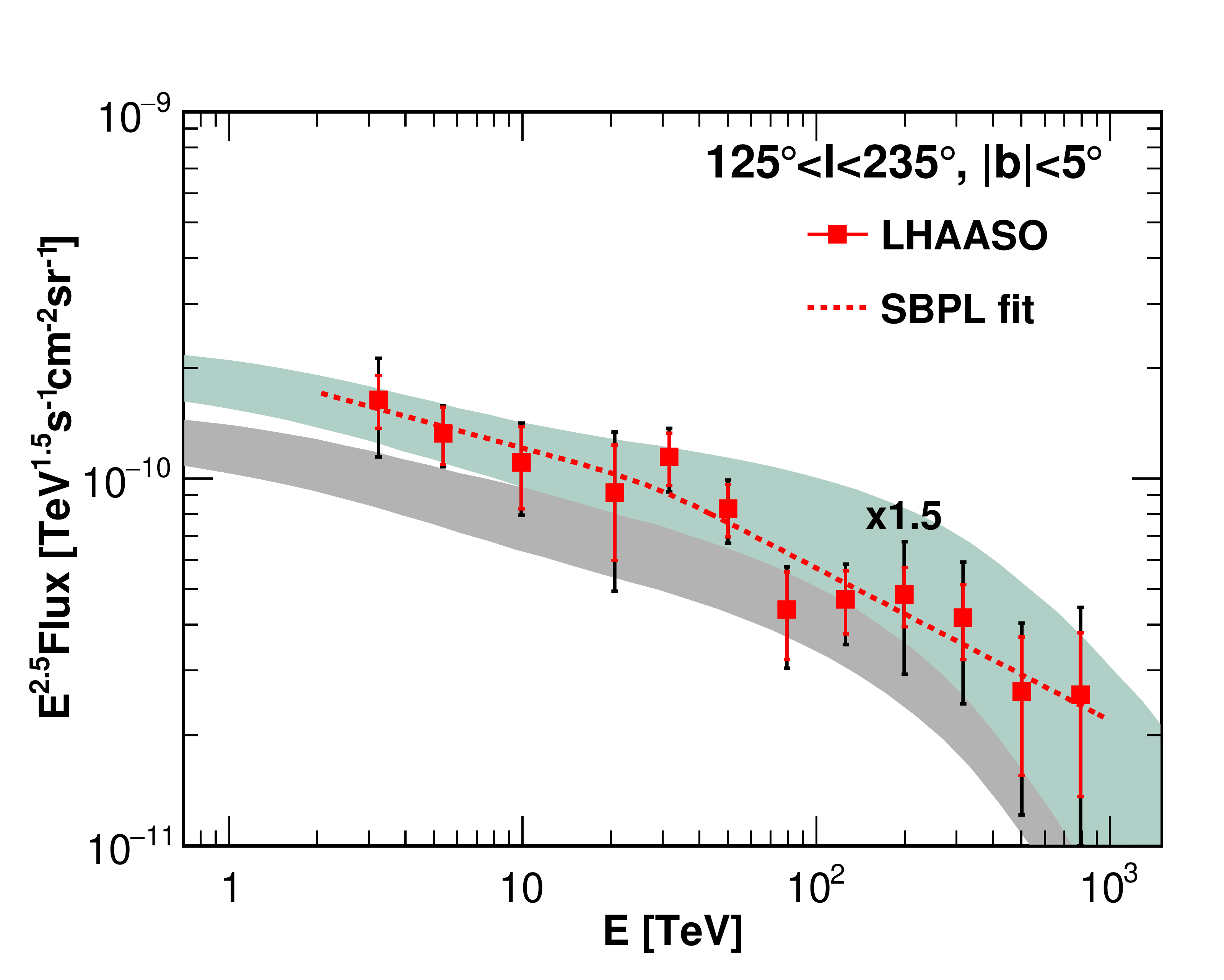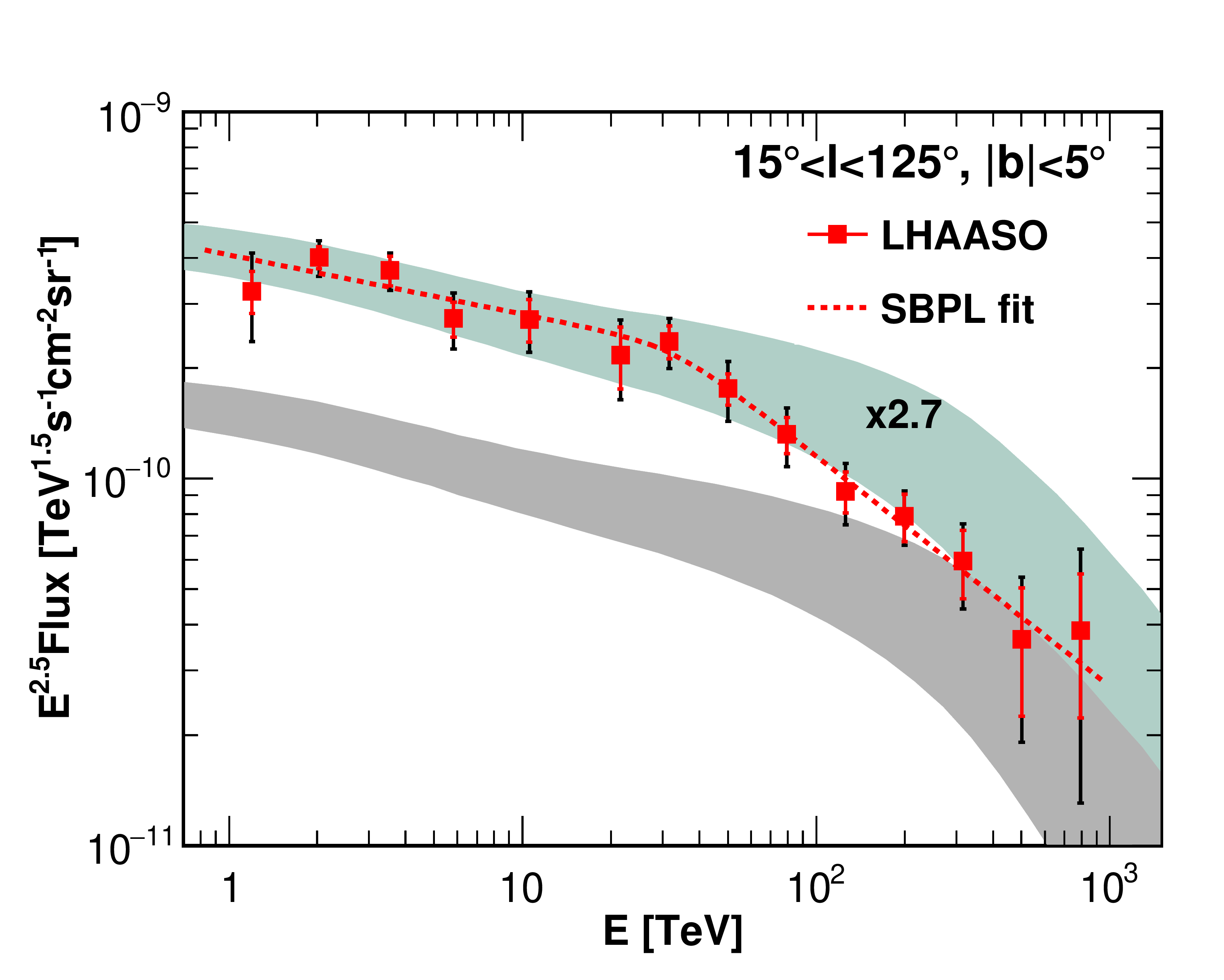 图1. LHAASO测量的弥散伽马射线流强(上图为内银盘区域,下图为外银盘区域)和传统理论模型预期(灰色阴影)的比较。浅蓝色阴影区域为传统模型增大2.7倍或1.5倍的结果。