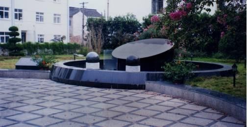 吴健雄逝世后,根据她的遗愿,安葬在故乡明德中学的紫藤阁旁.吴健雄墓园由三部分组成,墓园的主体呈圆形,由黑花岗岩铺设而成.墓穴安置在直径9米的水池之中,墓穴外部呈一斜面的圆柱体.圆柱体的斜面上镌刻着中文和英文的墓志铭.水池中间有两个直径60厘米的石球,每个球重300千克,用蓝珍珠花岗岩制成.接通电源,石球会随着水流分别顺向和逆向缓缓转动,球顶上分别喷出高低不同的水柱.这一设计思想是李政道提出的,他还题写碑文以作说明:“按宇称守恒定律,凡是两个左右完全对称系统的演变应该是永远左右对称的,这似乎极合理的定律于一九五七年正月被吴教授钴核子衰变实验推翻了.这建筑中两石球象征两个左右对称的钴核子,而其衰变产生的电子分布由水流代表,它们是不对称的.谨以此纪念吴健雄划时代的重大科学贡献.
