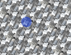 A few of the 5,000 close-packed robotic positioners that place the ends of optical fibers to collect the light from a single galaxy or quasar. The blue circle represents a patch of sky with numerous astronomical targets reachable by a single robot. In seconds it can rotate, extend, or retract to place its fiber in position with millionths of a meter precision. (Image R. Lafever, DESI Collaboration)