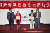 姜晓明副所长也非常关心青年人的成长,对于青年创新论坛的创办给予了大力的支持。启动仪式上,姜晓明副所长为论坛作了致辞,强调中国科学技术的未来发展,从根本上依赖于今天对青年科技人才的吸纳、培养和使用。随后,王焕玉书记和姜晓明副所长为青年创新论坛logo揭幕,并且为logo的最佳设计者——实验物理中心的马想、优秀设计者——实验物理中心的谢宇广颁发了获奖证书。