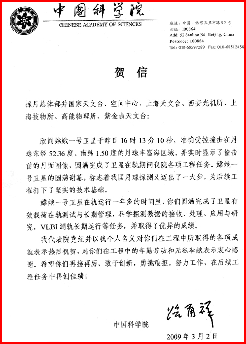 全国人大常委会副委员长、中国科学院院长路甬祥向我所和空间中心、探月总体部并国家天文台、上海天文台、西安光机所、上海技物所、紫金山天文台等单位发来贺信,对全体工作单位在工程中的辛勤劳动和无私奉献表示衷心感谢,并希望今后再接再厉,敢于创新,勇挑重担,努力工作,在后续工程任务中再创佳绩。贺信全文如下:
