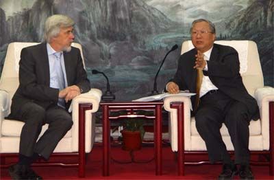 路甬祥首先对霍依尔博士一行的到访表示热烈的欢迎。会见中,他深情地回顾了十年前首次访问CERN的情形,CERN那时已成为世界高能物理研究领域最重要的研究中心,给他留下了十分深刻的印象。CERN与中国科技界的合作由来已久,中国在上世纪六十年代就派出科技代表团访问CERN。中国改革开放以后,CERN与中国的科技界发展了很好的合作关系,包括大学,特别是高能所。通过人员交流,中国的科学家,特别是年轻的科学家参与CERN的研究项目,受到了训练,学到了许多东西。通过合作,不仅是在高能物理的基础研究领域,在其他广泛的领域里我们都受益匪浅,比如高能所通过与CERN的合作率先在中国接入了互联网。路甬祥代表中科院感谢CERN,并表示中科院将一如既往地支持下属的研究所和科学家继续参与CERN新的研究项目,发展和扩大这一合作。