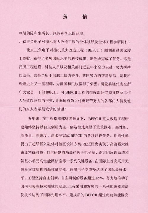 高能所党委发贺信祝贺北京正负电子对撞机重大改造工程(BEPCII)顺利通过国家验收,贺信全文如下: