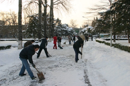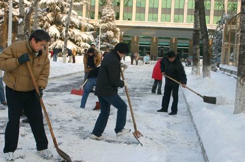 2010年1月3日,北京市降下了新年第一场大雪,高能所园区银装素裹、分外妖娆,但是各条主干道也被积雪覆盖,给所内职工家属的出行带来了很大不变。4号早上一上班,不等所党办发出通知,各党支部就已经组织本单位党员职工冒着严寒清扫本单位责任区内的积雪。经过一个多小时的努力,高能所园区主要干道的积雪已经被铲除,方便了大家出行。