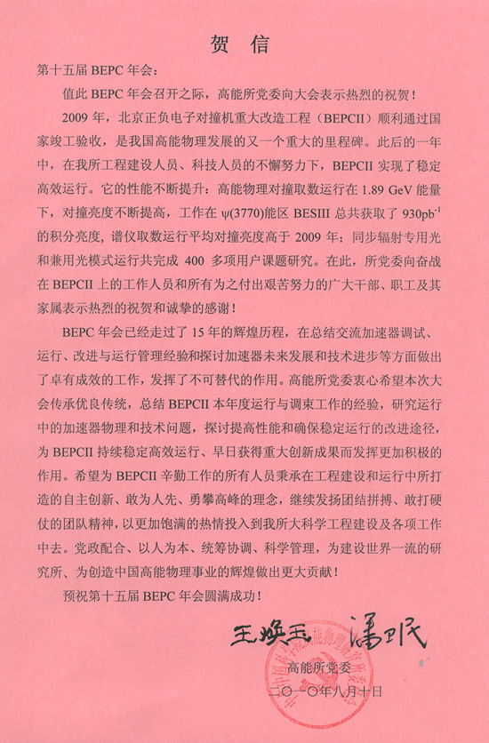 高能所党委信贺第十五届BEPC年会召开