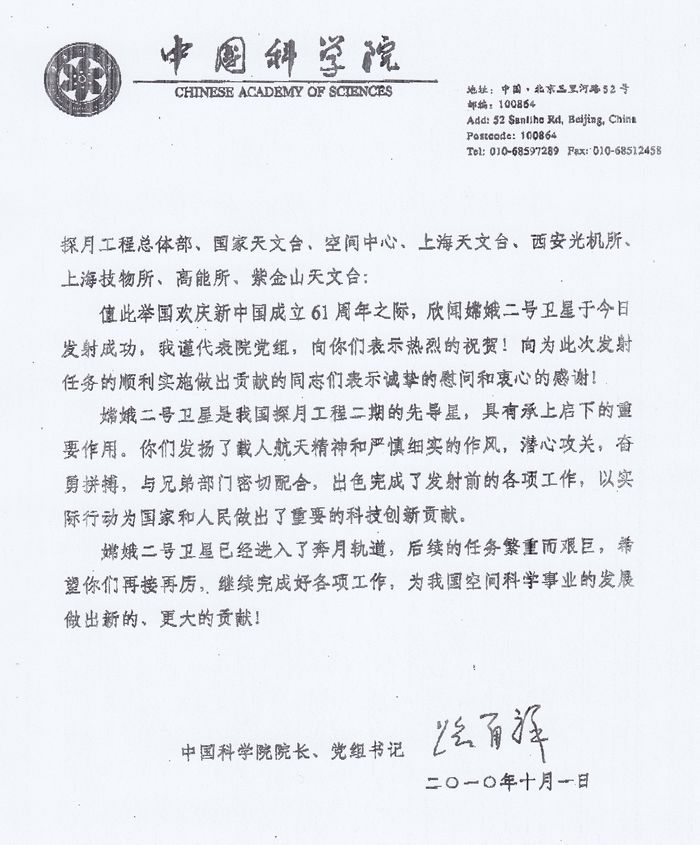 2010年10月1日18时59分57秒,在西昌卫星发射中心,“嫦娥二号”点火后发射,并成功进入奔月轨道。中国科学院院长、党组书记路甬祥代表院党组向我所及探月总体部、国家天文台、空间中心、上海天文台、西安光机所、上海技物所、紫金山天文台等中科院“嫦娥二号”有关研制单位发来贺信表示热烈的祝贺,贺信全文如下: