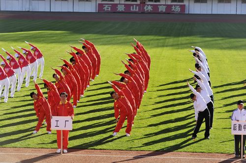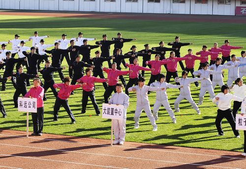 首先,由14个单位220人组成的第八套广播操比赛比赛方阵为本届运动会开启了序幕。绿茵场上,各代表队队员身着统一的运动服,以整齐划一的动作,饱满向上的精神面貌,给观众留下了深刻的印象。