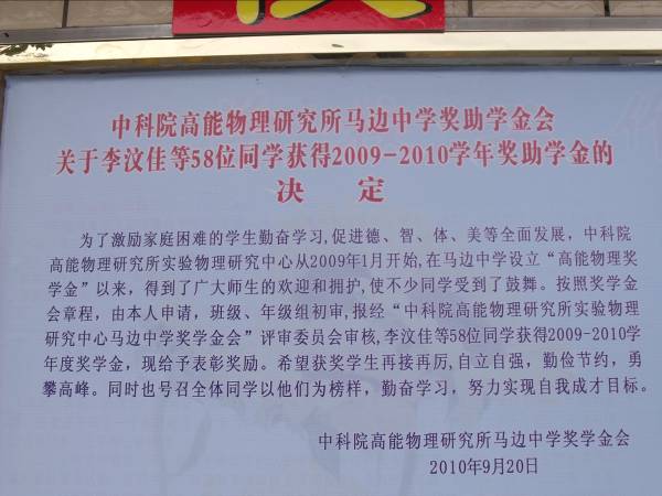 快盈v3实验物理中心马边中学奖助学金于2008年设立,由实验物理中心职工和学生自发捐款,每年资助马边中学的贫困优秀学生,帮助他们完成学业,以更好地为建设家乡服务。2010年科技财务党支部也加入到捐助行列,从而使得资助范围更加广泛。