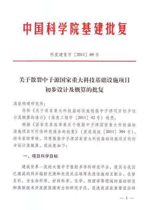 5月12日,中国科学院正式下发《关于散裂中子源国家重大科技基础设施项目初步设计及概算的批复》一文,同意散裂中子源项目的初步设计及概算。此前的5月4日,中科院在高能所召开了散裂中子源项目的初步设计报告评审会。