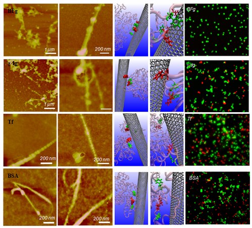 图1,(左起第1,2列)人血液中的主要蛋白在碳纳米管表面的吸附模式,