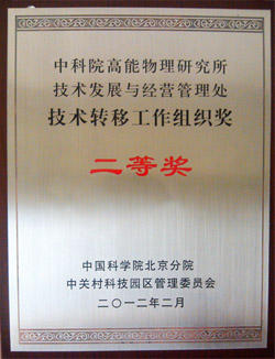 2011年该奖项设立并首次进行评选,在技术发展与经营管理处的精心组织下,对高能所近几年的科技成果转移转化工作进行了细致的梳理分析和总结,根据总结结果申报了科研团队 “科技成果转化奖”及技术转移团队“技术转移工作组织奖”两项。高能所民用核技术产业化孵化团队荣获首批“科技成果转化奖”二等奖,技术发展与经营管理处荣获首批“技术转移工作组织奖”二等奖。