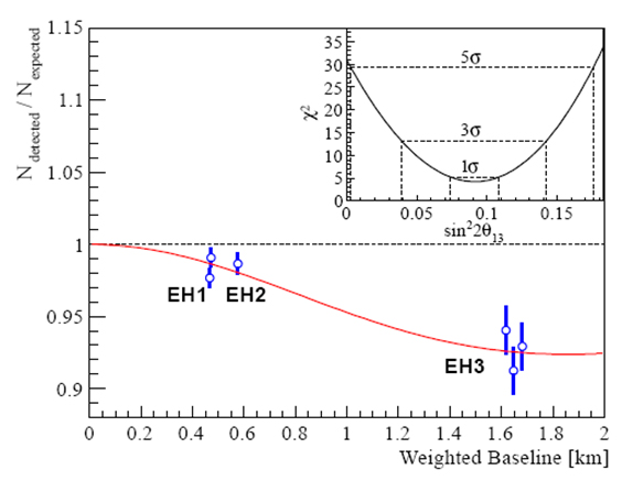 (实验表明,sin22θ13为9.2%,误差为1.7%,以超过5倍的标准偏差确定sin22θ13不为零,首次发现了这种新的中微子振荡模式。)