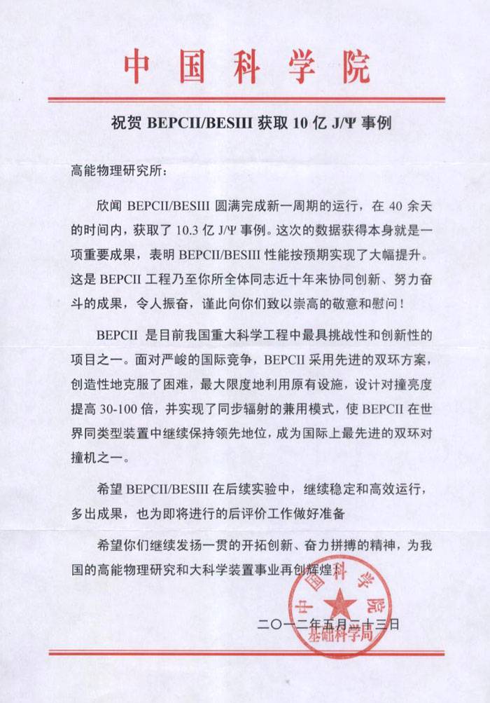 5月23日,中科院基础局发来贺信,祝贺高能所BEPCII/BESIII圆满完成新一周期的运行,在40余天的时间内,获取了10.3亿个J/Ψ事例,并希望BEPCII/BESIII在后续实验中,继续稳定和高效运行,多出成果,希望高能所为我国的高能物理研究和大科学装置事业再创辉煌。贺信全文如下: