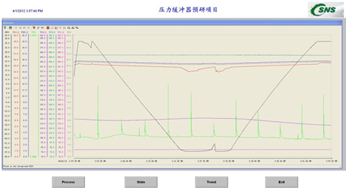 2012年2月,压力缓冲器加工完成运回高能所低温厅;2012年3月下旬,完成压力缓冲器的常温、液氮低温性能测试;2012年5月中旬,在第二十四届国际低温工程大会(ICEC24)上报告了CSNS压力缓冲器的设计、测试情况;2012年6月,压力缓冲器起运高能所东莞分部中国散裂中子源机电技术研发联合实验室。