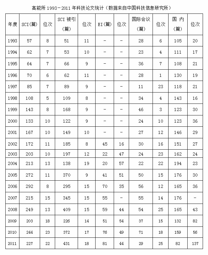 据《科学引文索引扩展版》(SCIE)数据统计:高能所2006-2010年由SCI收录的论文在2011年被引用431篇,1545次,居全国研究机构第18位(2005-2009年由SCI收录的论文在2010年被引用372篇,1282次,居全国研究机构第17位),下降了1位。2002-2011年SCI收录论文累积被引用1519篇,19772次,居全国研究机构第16位(2001-2010年SCI收录论文累积被引用1405篇,15497次,居全国研究机构第16位),与上一统计年持平。高能所2011年发表SCI论文227篇,在全国研究机构中列第22位;其中表现不俗的论文数为58篇,占总论文数的25.55%,高于全国平均水平,居全国研究机构第29位(2010年发表SCI论文244篇,其中表现不俗的论文数为43篇,占总论文数的20.28%,居全国研究机构第24位)。2011年度,SCI收录中国天文领域科技论文数量机构排名中,高能所荣获第4位,比2010年上升2位。