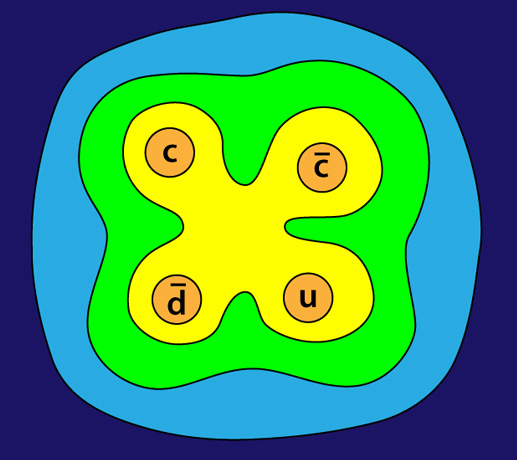 Swanson认为,BESIII实验发现的新粒子Zc(3900)对于我们理解强子的基本结构非常重要。和我们所熟悉的常规的强子(重子和介子)不同,Zc(3900)质量很大(约为质子质量的四倍),并且衰变成J/ψ粒子,这暗示它最有可能含正负粲夸克对;但是由正负粲夸克对构成的粒子都是电中性的,这和Zc(3900)带电性质矛盾,因此Zc(3900)还应该含有其他的夸克组分,一种可能的组合是Zc(3900)由四个夸克组成,如图所示。“如果四夸克解释得到确认,粒子家族中就要加入新的成员,我们对夸克物质的研究就需要扩展到新的领域。”,Swanson说,“尽管当前的实验数据还不能对此作出定论,但是这表明我们对于夸克的理解还有很长的路要走。”