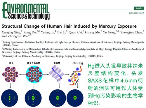 贵州省万山地区是我国最大的汞生产基地,持续到2001年的长期汞矿开采活动对该地区的生态环境系统造成了一定的破坏。为了评估环境汞污染对人体的影响,该研究以贵州万山汞污染地区的人发为研究对象,并以无汞污染的北京地区人发作为对照组,利用北京同步辐射装置SAXS技术对照研究了汞污染和未受汞污染头发的纳米尺度结构,比较了万山汞污染区居民、矿工、以及北京非汞污染区居民发样的结构差异。结果发现:汞进入头发皮质层中,通过与核心蛋白上的半胱氨酸形成S-Hg-S键合,使细胞外基质(ECM)中的蛋白糖发生结构扭曲,导致原来取向有序的聚糖纤维状结构发生无规则卷曲,这一影响表现在SAXS花样上就是过量汞导致了4.5-nm的衍射峰消失。因此,头发SAXS花样的这一变化可作为人体受到汞污染的生物学标识。